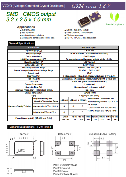 MERCURY晶體,壓控晶體振蕩器,G324晶振.有源晶振,是只晶體本身起振需要外部電壓供應,起振后可直接驅動CMOS 集成電路,產(chǎn)品本身已實現(xiàn)與薄型IC(TSSOP封裝,TVSOP封裝)同樣的1mm厚度,斷開時的消費電流是15 µA以下,編帶包裝方式可對應自動搭載及IR回流焊接(無鉛對應)產(chǎn)品有幾種電壓供選.