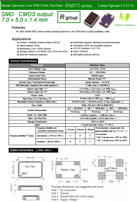 MERCURY晶振,臺(tái)產(chǎn)有源晶振,HM572R時(shí)鐘晶體振蕩器.貼片式石英晶體振蕩器,低電壓?jiǎn)?dòng)功率,并且有多種電壓供選擇,比如有1.8V,2.5V,3.3V,3.8V,5V等,產(chǎn)品被廣泛應(yīng)用于,平板筆記本,GPS系統(tǒng),光纖通道,千兆以太網(wǎng),串行ATA,串行連接SCSI,PCI-Express的SDH / SONET發(fā)射基站等領(lǐng)域.符合RoHS/無(wú)鉛.