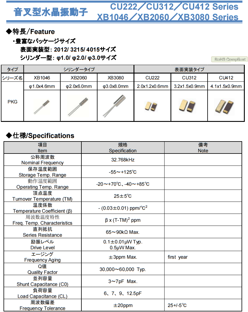 日本納卡晶振,無人機信號傳輸晶振,CU222 32.768K音叉晶體