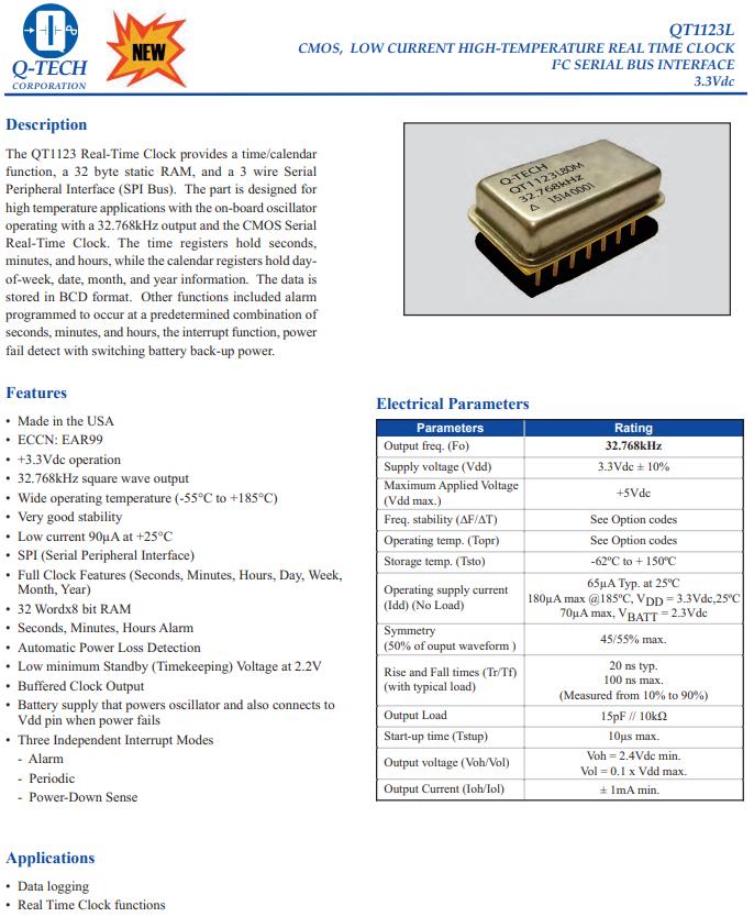 QT1123L88M-32.768kHz,實時時鐘應用晶振,32.768KHz進口晶振,Q-Tech晶振,QT1123L實時時鐘模塊,QT1123L88M-32.768kHz晶振,石英晶體,該器件設計用于板載振蕩器的高溫應用,采用32.768kHz輸出和CMOS串行實時時鐘,時間寄存器保存秒,分鐘和小時,而日歷寄存器保存星期、日期、月份和年份信息,數(shù)據(jù)是以BCD格式存儲,其他功能包括報警,被編程為在以下預定組合下發(fā)生 秒、分、小時、中斷功能、功率 通過切換電池備用電源進行故障檢測,實時時鐘應用晶振,數(shù)據(jù)記錄晶振.