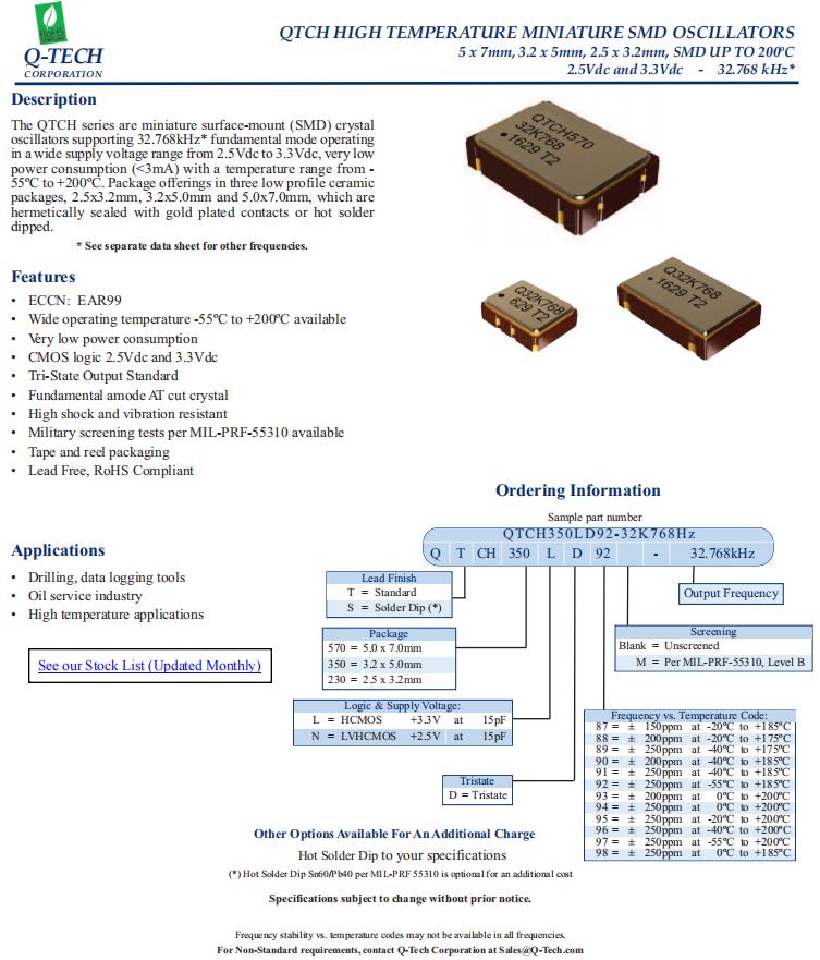 QTCH350LD92-32K768Hz,5032mm有源晶振,6G基站晶振,Q-Tech晶振,型號(hào)QTCH350,編碼QTCH350LD92-32K768Hz,是微型表面貼裝SMD晶體,支持32.768kHz*基模操作的石英晶體振蕩器,在2.5Vdc到3.3Vdc的寬電源電壓范圍內(nèi),有非常低的功耗(< 3mA),溫度范圍-55℃至+200℃,具有高抗沖擊和抗振動(dòng)性,6G基站晶振,鉆井、數(shù)據(jù)記錄工具晶振,高溫應(yīng)用晶振.