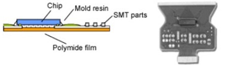IC芯片,貼片晶振等SMT部件安裝在薄膜基板上,不僅可以實(shí)現(xiàn)薄型封裝,還可以實(shí)現(xiàn)高自由度的輕質(zhì),緊湊和高密度封裝.而且,金或鍍錫的鉛可以粘合到金凸塊上,并且這種內(nèi)部引線鍵合方法具有低阻抗的特性.