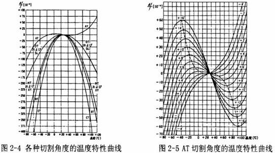 圖2-1是不同切割角度的溫度特性的比較。從圖中可以看出,當溫度在大于30℃時,按照AT角度切割的石英晶片的特性曲線比其他的特性曲線都平坦,說明在此溫度范圍內(nèi)溫度變化后頻率產(chǎn)生的偏移量最小,溫度特性也最佳,如圖2-5所示,同是AT切割的時候,當切割角度有少量偏差時溫度特性曲線也會隨之變化。
