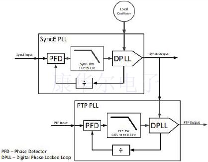 在這樣的同步系統(tǒng)中,每個網(wǎng)絡(luò)節(jié)點上都有一個本地振蕩器,它提供了時鐘到同步的鎖相環(huán)(PLL).取決于實現(xiàn)方式,PLL環(huán)路帶寬通常設(shè)置在1mHz至0.1Hz的范圍內(nèi).許多因素都會影響時間誤差性能.本地振蕩器的穩(wěn)定性是導(dǎo)致節(jié)點中產(chǎn)生時間誤差的主要因素.PLL濾波功能(PLL環(huán)路階數(shù),PLL環(huán)路帶寬)和輸入信號中的漂移量也是影響因素.