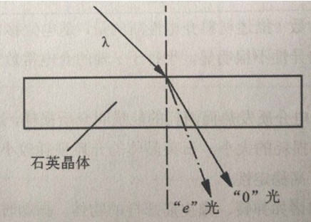 石英晶體也與其它一些物質(zhì)(如方解石CaCO3、硝酸鈉NaNO3晶體等)那樣具有雙折射現(xiàn)象,即一束光射入石英晶體時(shí),分裂成兩束沿不同方向傳拓的光其中一束光遵循折射定律,叫做尋常光或稱“0”光,另一束光不遵循折射定律,叫做非尋常光,又稱“e”光,如圖1.3.1所示,尋常光在石英晶體內(nèi)部各個(gè)方向上的折射率mo是相等的,而非尋常光在石英晶體的內(nèi)部各個(gè)方向的折射率n0卻是不相等的。例如:對(duì)于波長為5893A的光,石英晶體的n0=1.54425,最大的ne=1.5536。石英晶體雖然具有雙折射現(xiàn)象,但當(dāng)光沿z軸方向入射時(shí),不發(fā)生雙折射現(xiàn)象,所以又稱z軸為光軸