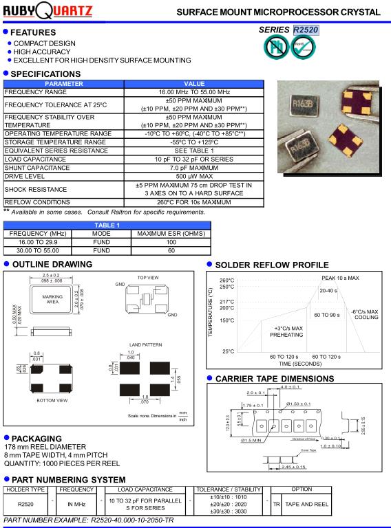 Rubyquartz盧柏晶振,R2520無源晶體,R2520-26.000-10-2050-TR晶振,小型貼片石英晶振,外觀尺寸具有薄型表面貼片型石英晶體振蕩器,特別適用于有小型化要求的市場領(lǐng)域,比如智能手機(jī),無線藍(lán)牙,平板電腦等電子數(shù)碼產(chǎn)品.晶振本身超小型,薄型,重量輕,晶體具有優(yōu)良的耐環(huán)境特性,如耐熱性,耐沖擊性,在辦公自動(dòng)化,家電相關(guān)電器領(lǐng)域及Bluetooth,WirelessLAN等短距離無線通信領(lǐng)域可發(fā)揮優(yōu)良的電氣特性,滿足無鉛焊接的回流溫度曲線要求.