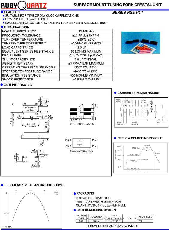 Rubyquartz晶振,RSE-H14貼片諧振器,RSE-32.768-12.5-H14-TR音叉晶體,32.768KHz時鐘晶體具有小型,薄型,輕型的貼片晶振表面音叉型晶體振蕩器,產(chǎn)品具有優(yōu)良的耐熱性,耐環(huán)境特性,可發(fā)揮晶振優(yōu)良的電氣特性,符合RoHS規(guī)定,滿足無鉛焊接的高溫回流溫度曲線要求,金屬外殼的封裝使得產(chǎn)品在封裝時能發(fā)揮比陶瓷振蕩器外殼更好的耐沖擊性.