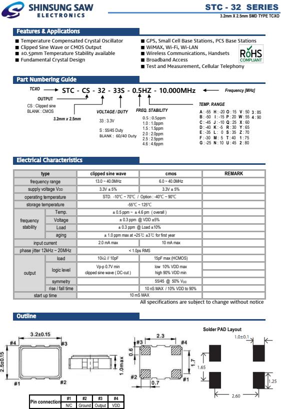 韓國新松晶振,STC-32溫度補償晶體振蕩器,STC-CS-32-33S-0.5HZ-16.000MHz晶振,小型SMD有源晶振,從最初超大體積到現(xiàn)在的7050mm,6035mm,5032mm,3225mm,2520mm體積,有著翻天覆地的改變,體積的變小也使產(chǎn)品帶來了更高的穩(wěn)定性能,接縫密封石英晶體振蕩器,精度高,覆蓋頻率范圍寬的特點,SMD高速自動安裝和高溫回流焊設(shè)計,Optionable待機輸出三態(tài)輸出功能,電源電壓范圍:1.8V~5V,高穩(wěn)定性,低抖動,低功耗,主要應(yīng)用領(lǐng)域:無線通訊,高端智能手機,平板筆記本W(wǎng)LAN,藍牙,數(shù)碼相機,DSL和其他IT產(chǎn)品的晶振應(yīng)用,三態(tài)功能,PC和LCDM等高端數(shù)碼領(lǐng)域,符合RoHS/無鉛.