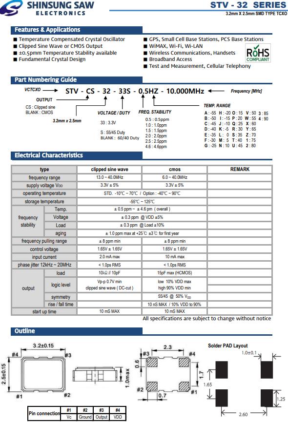 韓國新松晶振,STV-32貼片溫補晶振,STV-CS-32-33S-0.5HZ-10.000MHz有源振蕩子,小型SMD有源晶振,從最初超大體積到現(xiàn)在的7050mm,6035mm,5032mm,3225mm,2520mm體積,有著翻天覆地的改變,體積的變小也使產(chǎn)品帶來了更高的穩(wěn)定性能,接縫密封石英晶體振蕩器,精度高,覆蓋頻率范圍寬的特點,SMD高速自動安裝和高溫回流焊設(shè)計,Optionable待機輸出三態(tài)輸出功能,電源電壓范圍:1.8V~5V,高穩(wěn)定性,低抖動,低功耗,主要應用領(lǐng)域:無線通訊,高端智能手機,平板筆記本W(wǎng)LAN,藍牙,數(shù)碼相機,DSL和其他IT產(chǎn)品的晶振應用,三態(tài)功能,PC和LCDM等高端數(shù)碼領(lǐng)域,符合RoHS/無鉛.