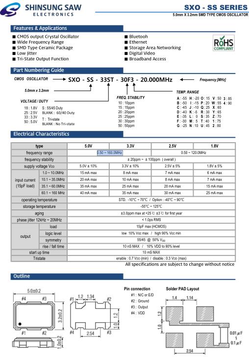 SHINSUNG低抖動晶振,SXO-SS通信設(shè)備晶振,SXO-SS-33ST-30F3-24.000MHz晶振,小型SMD有源晶振,從最初超大體積到現(xiàn)在的7050mm,6035mm,5032mm,3225mm,2520mm體積,有著翻天覆地的改變,體積的變小也使產(chǎn)品帶來了更高的穩(wěn)定性能,接縫密封石英晶體振蕩器,精度高,覆蓋頻率范圍寬的特點,SMD高速自動安裝和高溫回流焊設(shè)計,Optionable待機輸出三態(tài)輸出功能,電源電壓范圍:1.8V~5V,高穩(wěn)定性,低抖動,低功耗,主要應用領(lǐng)域:無線通訊,高端智能手機,平板筆記本W(wǎng)LAN,藍牙,數(shù)碼相機,DSL和其他IT產(chǎn)品的晶振應用,三態(tài)功能,PC和LCDM等高端數(shù)碼領(lǐng)域,符合RoHS/無鉛.