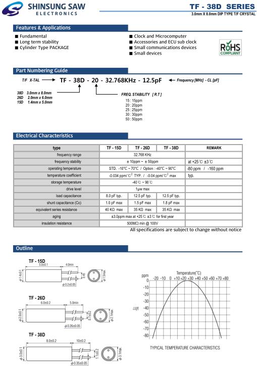 SHINSUNG新松晶振,TF-38D插件晶振,TF-38D-25-32.768KHz-12.5pF晶振,插件石英晶振,進(jìn)口音叉晶體最適合用于比較低端的電子產(chǎn)品,比如兒童玩具,普通家用電器,即使在汽車電子領(lǐng)域中也能使產(chǎn)品高可靠性的使用.并且可用于安全控制裝置的CPU時(shí)鐘信號(hào)發(fā)生源部分,好比時(shí)鐘單片機(jī)上的石英晶振,在極端嚴(yán)酷的環(huán)境條件下,晶振也能正常工作,具有穩(wěn)定的起振特性,高耐熱性,耐熱循環(huán)性和耐振性等