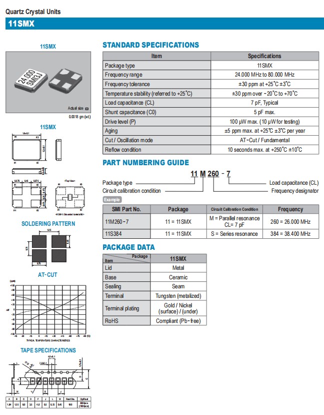 11M250-12晶振,日本SMI高精度晶體,移動通訊晶振,日本SMI晶振公司,高品質(zhì)晶振,低損耗晶振,1612晶振,超小型晶振,日本進口晶振,四腳晶振,石英晶振,貼片晶振,無源晶振,6G晶振,6G基站控制器晶振,11SMX晶振.貼片石英晶體,體積小,焊接可采用自動貼片系統(tǒng),產(chǎn)品本身小型,表面,特別適用于有小型化要求的市場領(lǐng)域,因產(chǎn)品小型,薄型優(yōu)勢,耐環(huán)境特性,包括耐高溫,耐沖擊性等,在移動通信領(lǐng)域得到了廣泛的應(yīng)用,晶振產(chǎn)品本身可發(fā)揮優(yōu)良的電氣特性,滿足無鉛焊接的高溫回流溫度曲線要求.