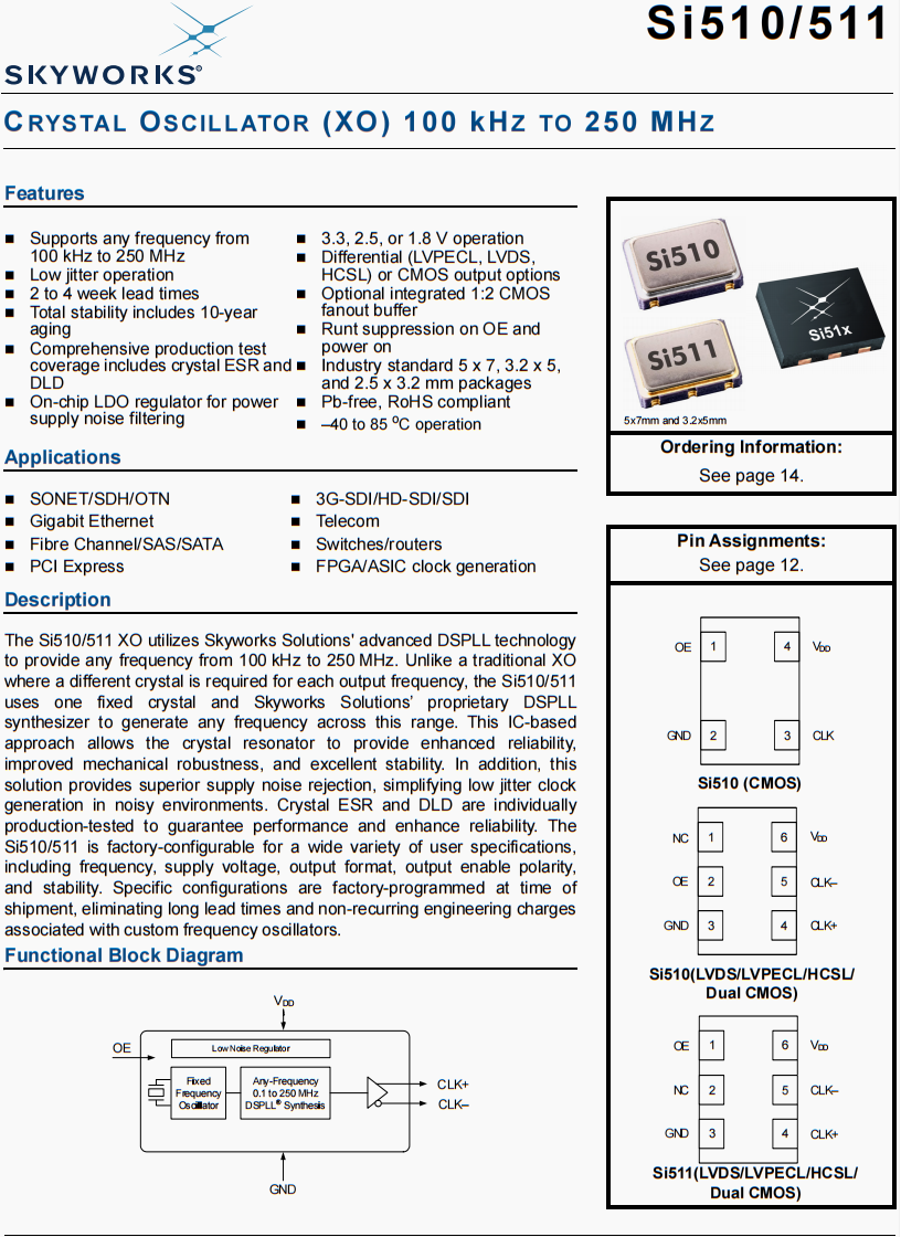 | 510FBA156M250BAG | Skyworks晶振 | Si510 | XO | 156.25 MHz | LVDS | 2.5V | ±25ppm |