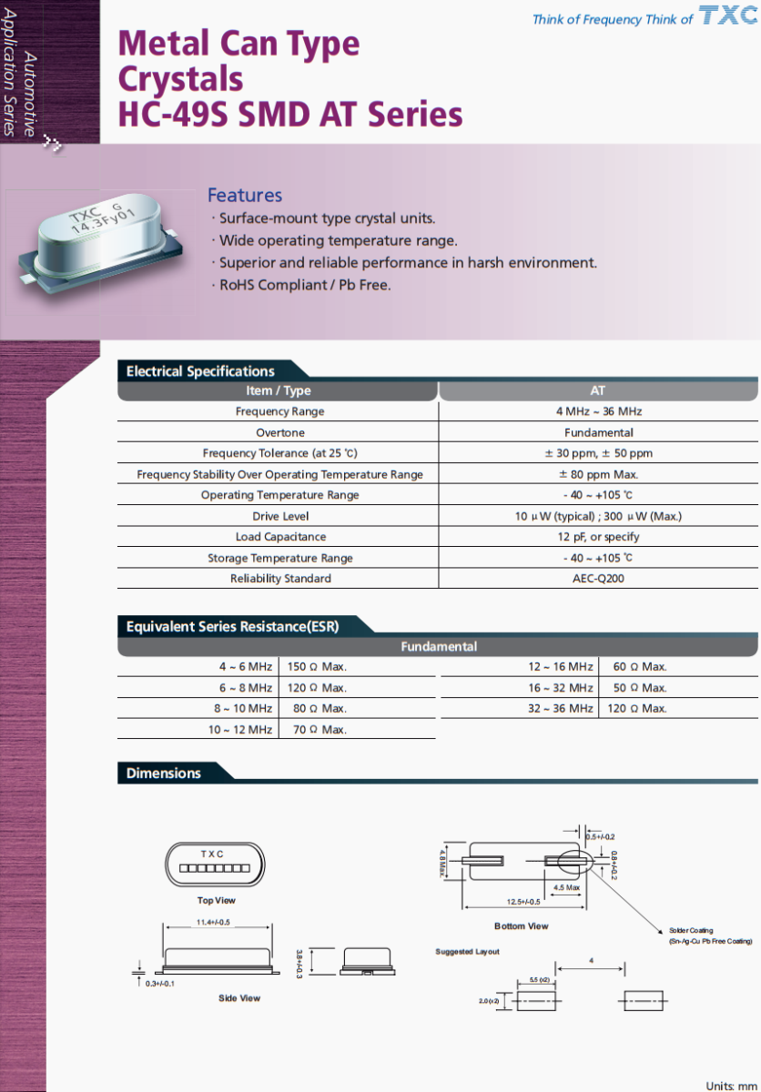 臺灣晶技晶振,車載多媒體晶振,AT-4.9152MDGE-T晶振,臺灣TXC晶振公司,晶技晶振,臺灣晶振,進(jìn)口晶振,石英晶振,四腳晶振,AT-20.500MDHQ-T晶振,貼片晶振,無源晶振,網(wǎng)絡(luò)設(shè)備晶振,汽車晶振,高品質(zhì)晶振,汽車氛圍燈晶振,大燈控制器晶振,小尺寸晶振,耐高溫晶振,金屬罐型,晶體, AT系列HC-49S SMD,特征,表面貼裝型晶體單元。工作溫度范圍寬。·惡劣環(huán)境下性能優(yōu)越可靠。符合RoHS標(biāo)準(zhǔn)/無鉛。