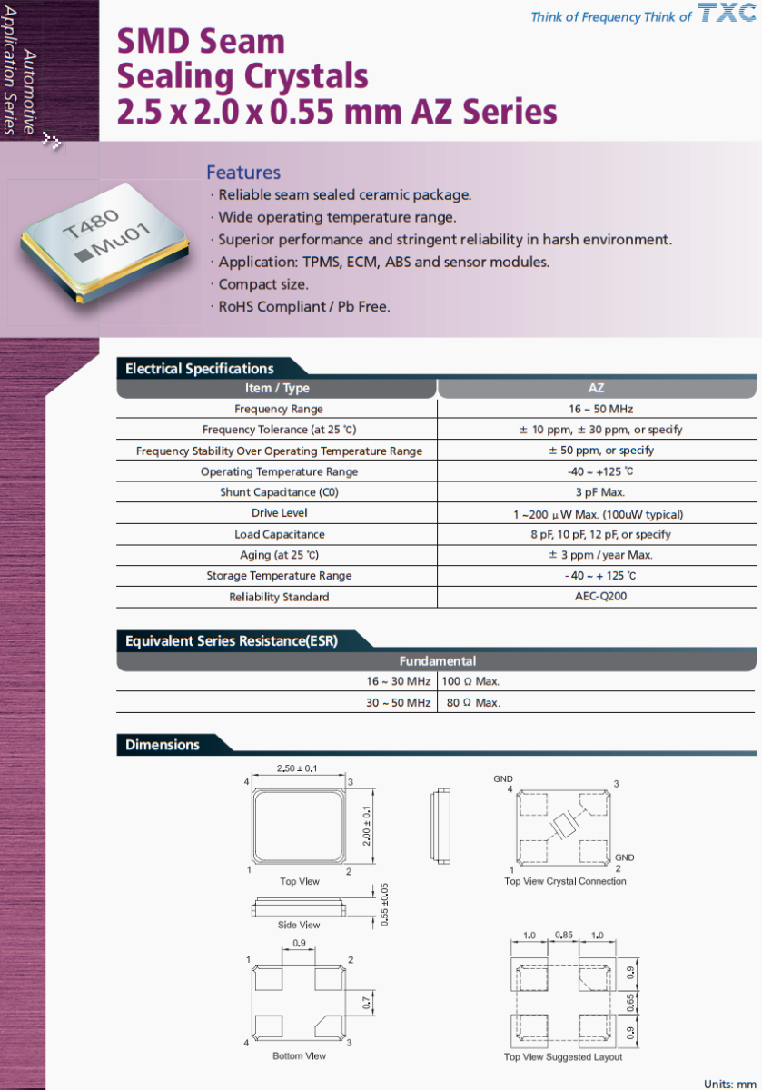 TXC晶振,無鑰匙進(jìn)入模塊晶振,AZ-37.400MEIQ-T晶振,臺(tái)灣TXC晶振公司,晶技晶振,AZ系列SMD接縫,密封晶體,2.5 x 2.0 x 0.55 mm ,特點(diǎn),可靠的接縫密封陶瓷封裝。工作溫度范圍寬。性能優(yōu)越,在惡劣環(huán)境下具有嚴(yán)格的可靠性。應(yīng)用范圍:TPMS, ECM, ABS,傳感器模塊。.ompact大小。符合rohs標(biāo)準(zhǔn)/不含鉛,臺(tái)灣晶振,進(jìn)口晶振,四腳晶振,無源晶振,網(wǎng)絡(luò)設(shè)備晶振,汽車晶振,高品質(zhì)晶振,汽車氛圍燈晶振,大燈控制器晶振,小尺寸晶振,耐高溫晶振,