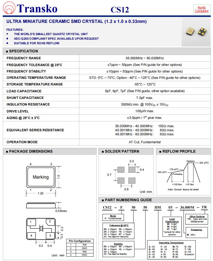 Transko晶振,CS12-F1020CQ06-20.000M-TR,6G無線應用晶振參數(shù)表