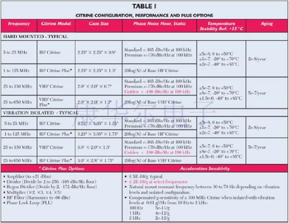 新型Citrine系列晶體振蕩器專為在要求靜態(tài)和動(dòng)態(tài)條件下具有低相位噪聲性能的最苛刻應(yīng)用提供廣泛的貼片晶振產(chǎn)品.黃水晶振蕩器可以配置為1~650MHz之間的任何固定頻率.黃水晶系列有八種配置.低頻HF振蕩器和VHF振蕩器均可使用,也可以不使用隔振系統(tǒng).而且,“PLUS”系列還提供HF和VHFCitrines,當(dāng)應(yīng)用需要額外的功能時(shí),可添加乘法器,分頻器,放大器,濾波器和雙輸出. Citrine系列具有多種包裝配置,可以根據(jù)頻率,所需的選件,性能規(guī)格和其他應(yīng)用注意事項(xiàng)進(jìn)行選擇.有關(guān)標(biāo)準(zhǔn)Citrine配置和性能選項(xiàng),請(qǐng)參見表1. 黃水晶靜態(tài)相位噪聲性能