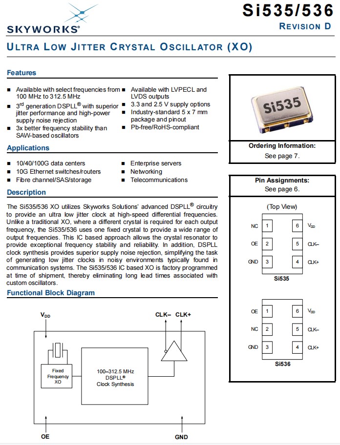 特點:可選擇頻率從100兆赫到312.5兆赫,第三代DSPLL®具有優(yōu)越的抖動性能和高功率電源噪聲抑制,比基于saw的振蕩器好3倍的頻率穩(wěn)定性,可用LVPECL和LVDS輸出差分晶振,3.3和2.5V供應(yīng)選項,工業(yè)標(biāo)準(zhǔn)7.0x5.0毫米包和針形,無鉛/rohs兼容