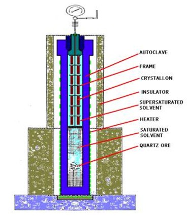 高品質(zhì)的天然石英晶體數(shù)量有限,而且價(jià)格很高,這就促使了合成石英制造業(yè)的發(fā)展。合成石英晶體在垂直的高壓釜里生產(chǎn),高壓釜以水熱法的原理工作,溫度大約為400℃,壓力為1000個(gè)大氣壓左右。籽晶放在高壓釜上部,天然石英原料被放在下部。升溫加壓的時(shí)候,高壓釜內(nèi)的溶液呈堿性。高壓釜的加熱裝置,在容器內(nèi)部制造出上部比下部溫度低的環(huán)境。這個(gè)溫度梯度造成溶解了底部天然石英的堿性溶液的對(duì)流,而且使天然石英沉積在頂部的籽晶片上。就是用這種方法生產(chǎn),它可以在幾星期內(nèi)長好幾百克。如果在溫度達(dá)到573℃的時(shí)候,α石英將相變成β石英(失去壓電特性)。
