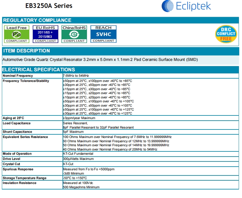 更多>>專屬于汽車電子控制板的Ecliptek高質(zhì)量晶振編碼EB3250YA12-12.000M TR