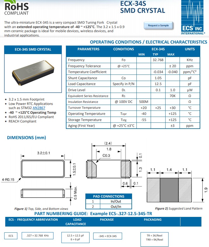 ECS晶振推出超小型ECX-34S系列,編碼ECS-.327-12.5-34S-TR,是一款非常緊湊的SMD音叉晶體,32.768kHz晶振,兩腳貼片晶振,擴展工作溫度范圍為-40℃至+125℃。小體積尺寸3.2x1.5x0.9mm陶瓷封裝,非常適合移動設(shè)備、無線設(shè)備和工業(yè)應(yīng)用,STM32 AN2867等低功耗RTC應(yīng)用,-40℃至+125℃工作溫度,符合RoHS 2011/65/EU標(biāo)準,符合REACH標(biāo)準.
