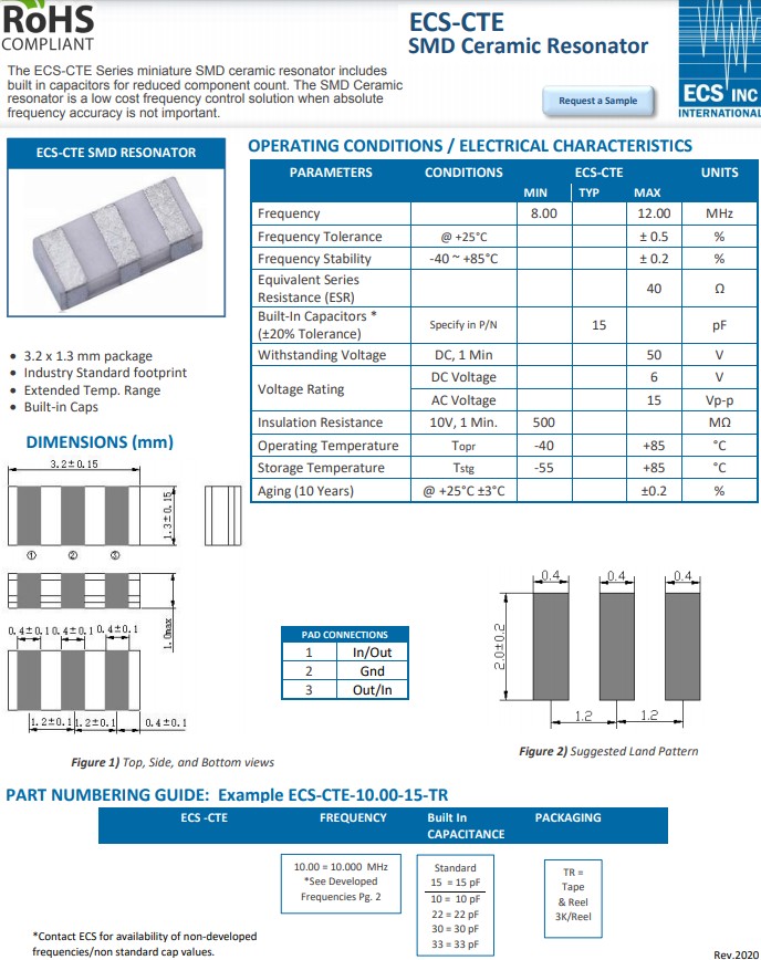 ECS-CTE-8.00-10-TR | 8 MHz | ±0.5% | -40°C ~ +85°C |