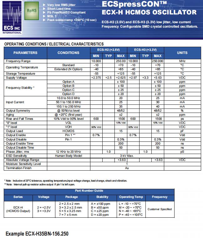 ECS公司利用自身獨特的創(chuàng)新能力開發(fā)編碼ECX-H27BN-30.000,尺寸為7050MM,ECS-H2(2.5V)和ECS-H3(3.3V)低抖動、低電流頻率可配置的SMD晶體控制振蕩器,有源晶振,非常低的均方根抖動,很短的前置時間,自由/RoHS2兼容XMSL1X峰值焊料溫度+260°C(10秒),產(chǎn)品具備高性能高質(zhì)量低電壓低抖動的特點,比較適合用于儀器設(shè)備,投影機,醫(yī)療產(chǎn)品,藍牙模塊等領(lǐng)域.