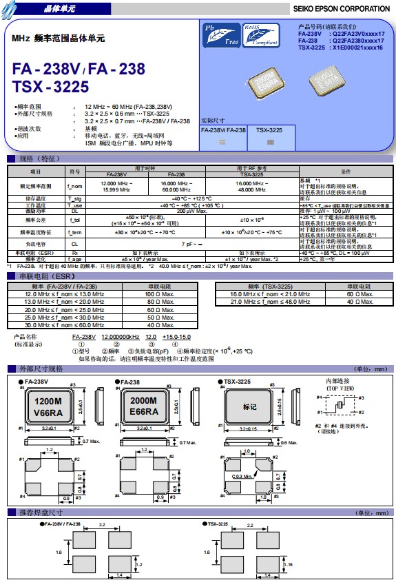日本愛(ài)普生晶振FA-238V是一款小體積尺寸3.2x2.5mm四腳貼片晶振,無(wú)源晶振,石英晶體諧振器,F(xiàn)A-238V頻率范圍12.000MHz至15.9999MHz之間,可以在-40℃至+85℃(+105℃)溫度內(nèi)穩(wěn)定工作,該產(chǎn)品具有超小型,輕薄型,耐熱、耐振、耐沖擊等優(yōu)良的耐環(huán)境特性,3225mm體積貼片晶振,該產(chǎn)品已被確定的高信賴性最適合用于汽車電子部件,在極端嚴(yán)酷的環(huán)境條件下也能發(fā)揮穩(wěn)定的起振特性。滿足無(wú)鉛焊接的高溫回流溫度曲線要求,符合AEC-Q200標(biāo)準(zhǔn)。被廣泛用于移動(dòng)通訊,智能手機(jī),平板電腦,汽車電子,移動(dòng)電話,無(wú)線藍(lán)牙,ISM頻段電臺(tái)廣播,MPU時(shí)鐘等.