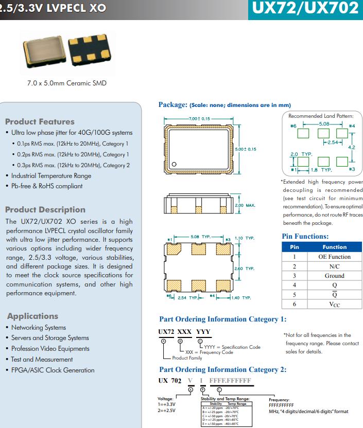 UX72/UX702 XO系列是高性能優(yōu)良的LVPECL時(shí)鐘晶體振蕩器家族具有超低抖動性能。它支持多種選擇,包括更廣泛的頻率量程,2.5/3.3電壓,各種穩(wěn)定性,以及不同的包裝尺寸。它的目的是的時(shí)鐘源規(guī)格通訊系統(tǒng)等高設(shè)備性能