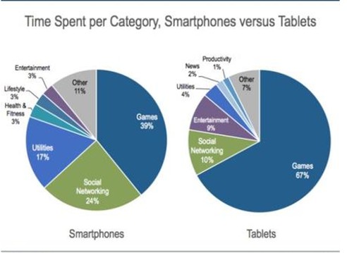 以上圖表反映了智能手機(jī)和平板電腦用戶使用的應(yīng)用類型。在平板電腦上,用戶更多地消費(fèi)媒體或從事娛樂活動(dòng)。在平板電腦的應(yīng)用使用中,游戲、娛樂和新聞分別占67%、9%和2%,合計(jì)達(dá)到近4/5。而在智能手機(jī)平臺(tái)上,用戶更多地關(guān)注通信和任務(wù)的完成。社交網(wǎng)絡(luò)、工具、運(yùn)動(dòng)健康和生活方式類應(yīng)用分別占用戶使用的24%、17%、3%和3%。
