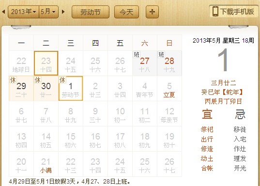 奉天承運,國家黨的安排,2013年5月1號勞動節(jié)放假時間如下,4月29號,30號-5月1號,共三天。