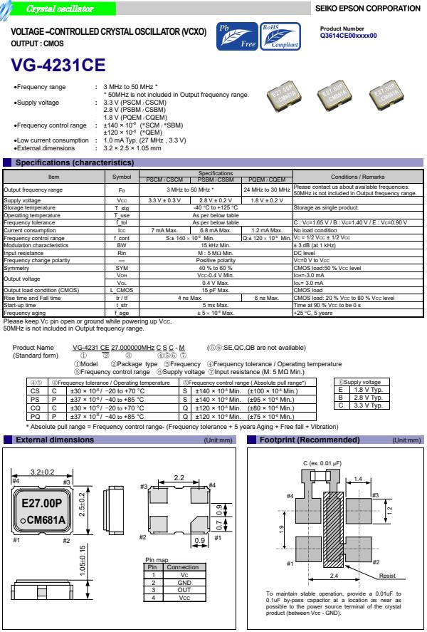 | Q3614CE00001200 | VG-4231CE | 27.000000 MHz | CSC-M | 3.20 x 2.50 x 1.05 mm | CMOS | 3.000 to 3.600 V | 1.65 +/-1.65V | +/-100 ppm | +/-140 ppm | -20 to 70 °C |