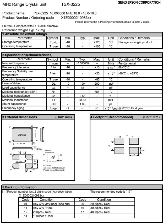 | X1E000021098316 | 3.2 x 2.5 x 0.6mm | TSX-3225 | 16.000000 MHz | 18 pF | +/-10 ppm | +/-20 ppm | -40 to +85 °C |