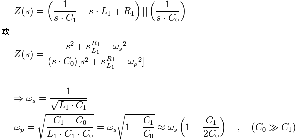 個頻率接近但特性不同的共振點:低阻抗的串聯(lián)共振點與高阻抗的并聯(lián)共振點。 運用拉普拉斯轉換,該等效電路網(wǎng)絡的阻抗可以寫成以下數(shù)學式: