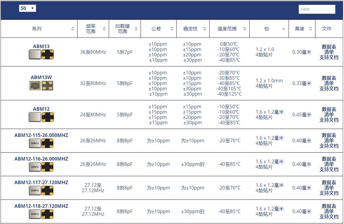 ABM8晶振系列原廠代碼表: