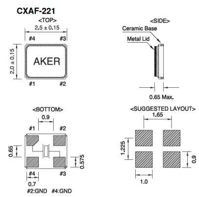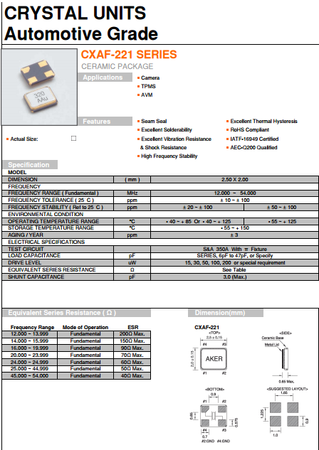 AKER晶振,AKER貼片晶振,CXAF-221諧振器.貼片石英晶體,體積小,焊接可采用自動(dòng)貼片系統(tǒng),產(chǎn)品本身小型,表面貼片晶振,特別適用于有小型化要求的電子數(shù)碼產(chǎn)品市場(chǎng)領(lǐng)域,因產(chǎn)品小型,薄型優(yōu)勢(shì),耐環(huán)境特性,包括耐高溫,耐沖擊性等,在移動(dòng)通信領(lǐng)域得到了廣泛的應(yīng)用,晶振產(chǎn)品本身可發(fā)揮優(yōu)良的電氣特性,滿足無鉛焊接的高溫回流溫度曲線要求.