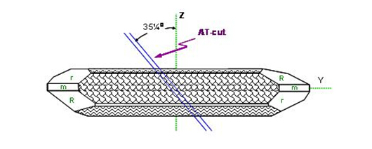 在各種不同種類的切割角度方式中, AT角度切割的石英芯片適用在數(shù)MHz到數(shù)佰MHz的頻率范圍,是石英芯片應(yīng)用范圍最廣范及使用數(shù)量最多的一種切割應(yīng)用方式. 在(圖五)中, 從石英晶棒X-軸向的上視圖, 可以看到對Z-軸向旋轉(zhuǎn)約35度的AT 方向. 這在大量生產(chǎn)的技術(shù)上也是很好達(dá)成的一種作業(yè)方式.