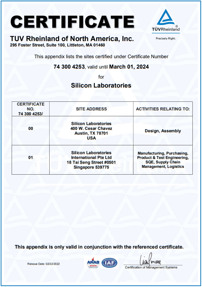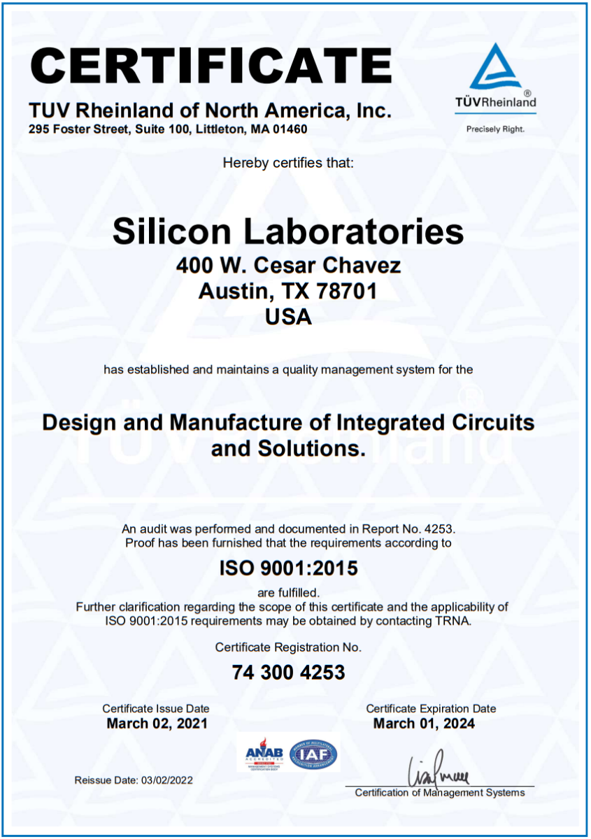 要求卓越的質(zhì)量的Silicon晶振通過ISO9001認證標準,可持續(xù)發(fā)展是Silicon晶振一切工作不可或缺的一部分,努力減少資源使用,減少生產(chǎn)過程對環(huán)境的影響,并提供符合環(huán)境法規(guī)和要求的產(chǎn)品。Silicon晶振要求卓越的質(zhì)量和環(huán)境管理體系,每個體系都分別通過了認證ISO 9001:2015 認證標準。Silicon Labs是EPA綠色電力合作伙伴,致力于在可用的情況下增加對可再生能源的使用。Silicon采用積極主動的計劃來減少辦公室用水量,并采取措施提高回收和電子處置選項的可用性,從而提高我們的轉(zhuǎn)化率。