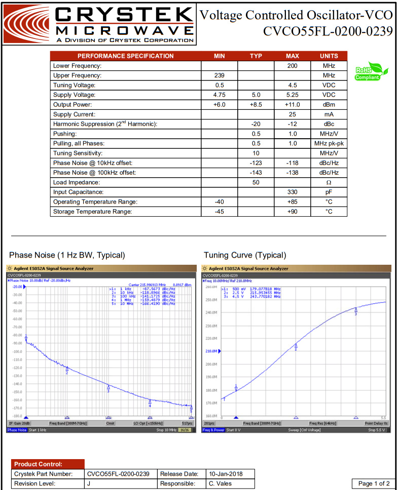 CVCO55FL-0200-0239在美國設(shè)計(jì)和制造,采用行業(yè)標(biāo)準(zhǔn)的0.5 x 0.5英寸SMD封裝。輸入電壓為5v,最大電流消耗為25ma。拉力和推力分別最小化到1.0 MHz pk-pk和1.0 MHz/V。二次諧波抑制典型值為-20 dBc。