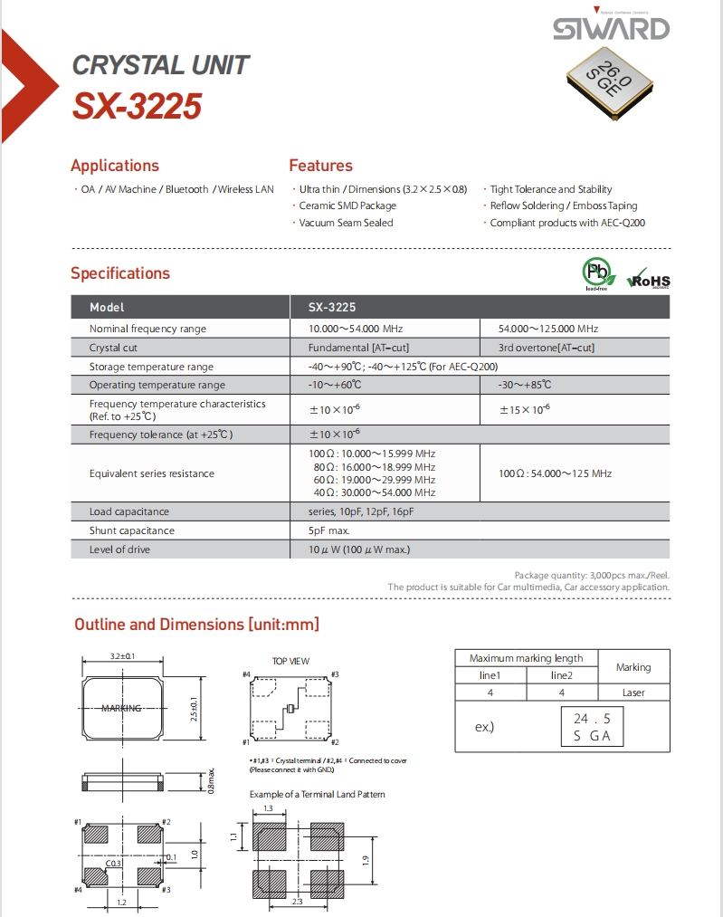 | XTL571200-V42-001 | Siward晶振 | SX-3225 | 12 MHz | ±20ppm | 20pF | -10°C ~ 70°C |