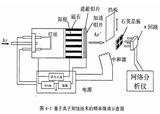 圖4-1是基于離子刻蝕技術(shù)的頻率微調(diào)示意圖[3],晶振離子刻蝕頻率微調(diào)方法,當(dāng)照射面積小于 2~3mm2,在beam電壓低于100V以下就可獲得接近10mA/cm2的高電流密度的離子束,離子束的刻蝕速度在寬范圍內(nèi)可進(jìn)行調(diào)節(jié)。圖中采用的是小型熱陰極PIG型離子槍,放電氣體使用Ar,流量很小只需035cc/min。在:圓筒狀的陽極周圍安裝永久磁石,使得在軸方向加上了磁場這樣的磁控管就變成了離子透鏡[17], 可以對(duì)離子束進(jìn)行聚焦。熱陰極磁控管放電后得到的高密度等離子,在遮蔽鉬片和加速鉬片之間加高達(dá)1200V高壓后被引出。并且可以通過對(duì)熱陰極的控制調(diào)整等離子的速度。