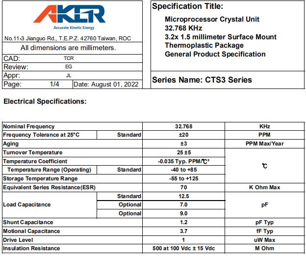 32,768赫茲音叉無源晶體的唯一標準頻率來自哪里?要理解這一點,你必須知道石英晶體的頻率取決于它的形狀和大小。一個自然頻率只有1赫茲的石英會如此之大,它更適合“大本鐘”鐘樓,而不是手表。顯然,從生產(chǎn)和使用的角度來看,這是相當不切實際的,所以有一個特殊的技巧。Aker公司匠心締造石英晶體編碼CTS3-32.768-9-20-R,Crystal,無源晶振,頻率為0.032768MHz,頻率公差為±20ppm (Tol) ,負載電容為9pF,腳位為2-Pin,SMD,T/R.